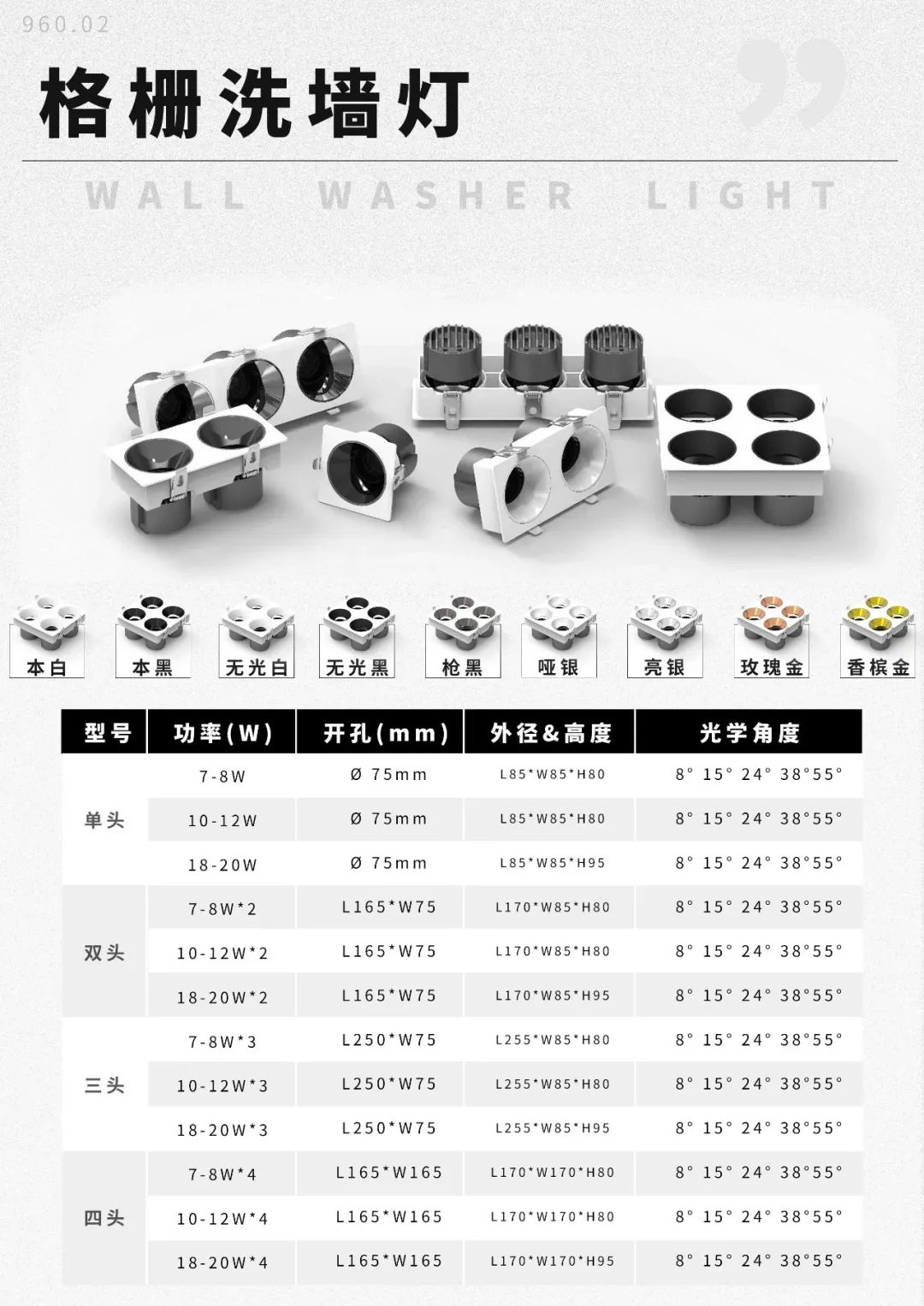 “王炸”系列LED、COB洗墙灯,提供5款外壳选择,包括:王炸无边框(夹板)洗墙灯、王炸可调无边框(夹板)洗墙灯、王炸不可调无边框(批灰)洗墙灯、王炸格栅COB洗墙灯、王炸COB洗墙灯。