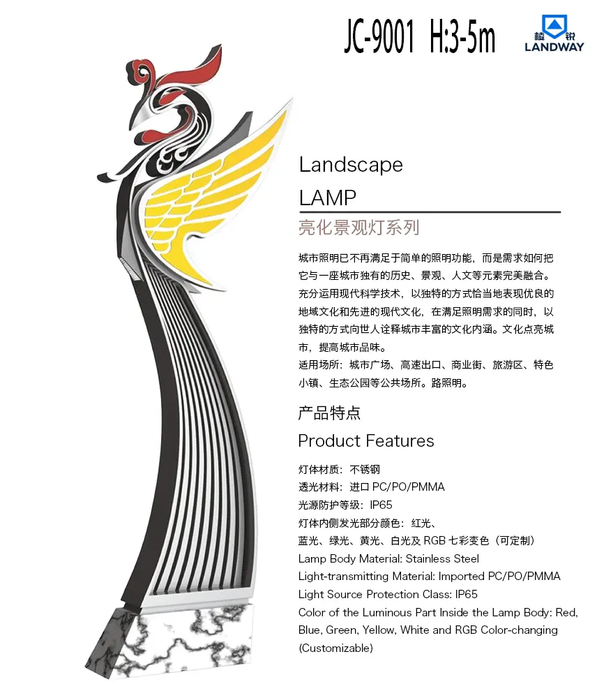 灯体内侧发光部分颜色:红光、蓝光、绿光、黄光、白光及RGB七彩变色(可定制)适用场所:城市广场、高速出口、商业街、旅游区、特色小镇、生态公园等公共场所。