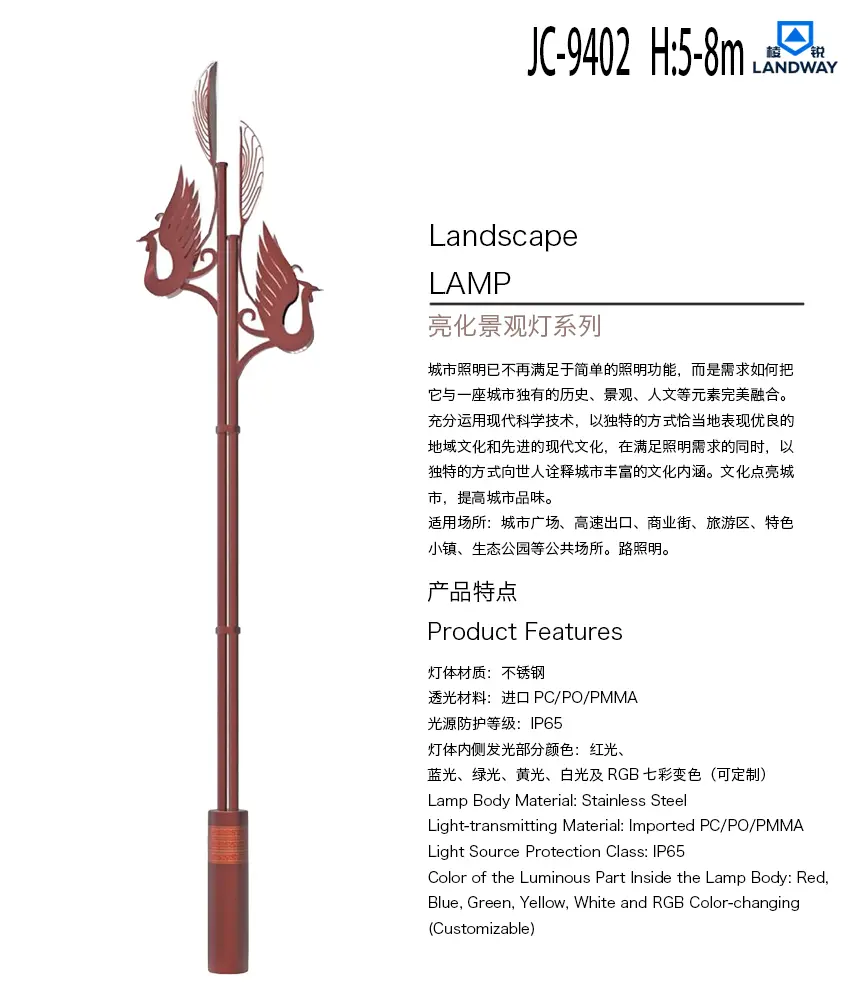 灯体内侧发光部分颜色:红光、蓝光、绿光、黄光、白光及RGB七彩变色(可定制)适用场所:城市广场、高速出口、商业街、旅游区、特色小镇、生态公园等公共场所。