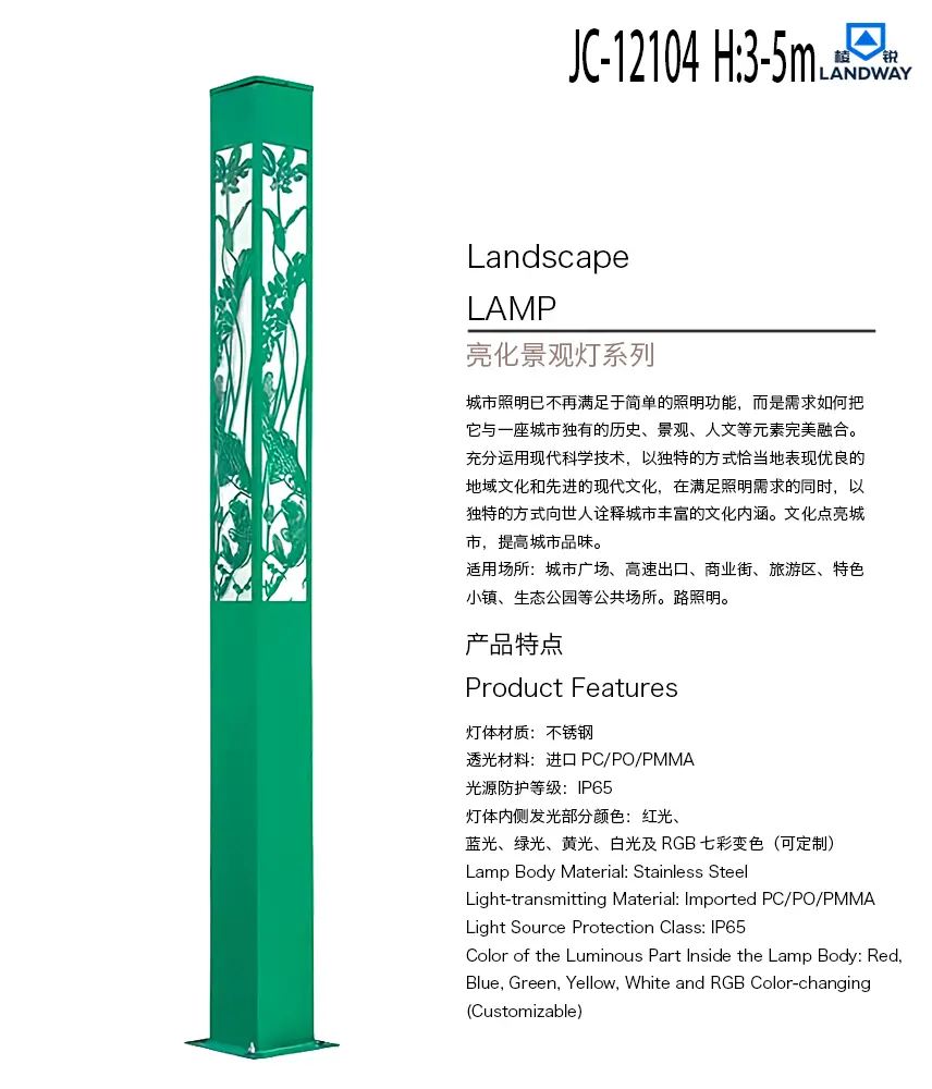 灯体内侧发光部分颜色:红光、蓝光、绿光、黄光、白光及RGB七彩变色(可定制)适用场所:城市广场、高速出口、商业街、旅游区、特色小镇、生态公园等公共场所