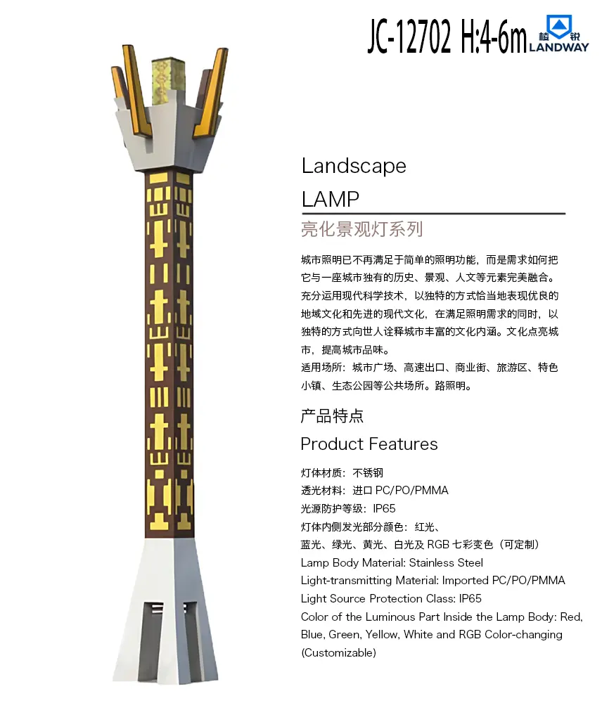 灯体内侧发光部分颜色:红光、蓝光、绿光、黄光、白光及RGB七彩变色(可定制)适用场所:城市广场、高速出口、商业街、旅游区、特色小镇、生态公园等公共场所