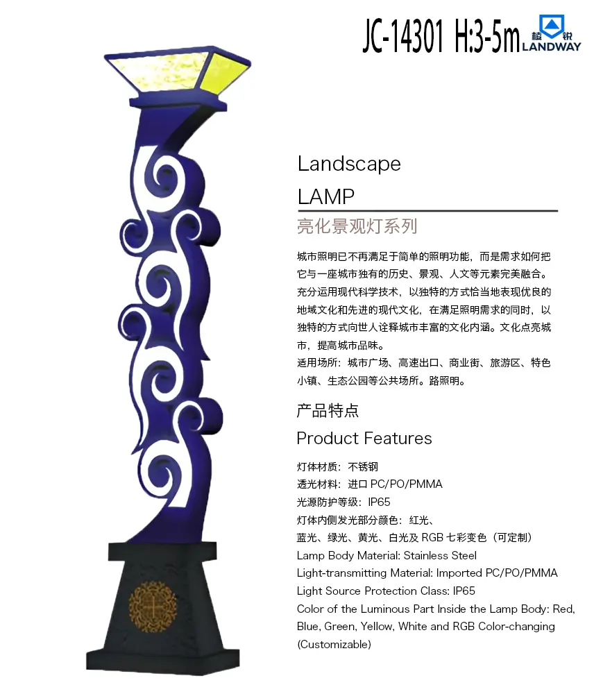灯体内侧发光部分颜色:红光、蓝光、绿光、黄光、白光及RGB七彩变色(可定制)适用场所:城市广场、高速出口、商业街、旅游区、特色小镇、生态公园等公共场所