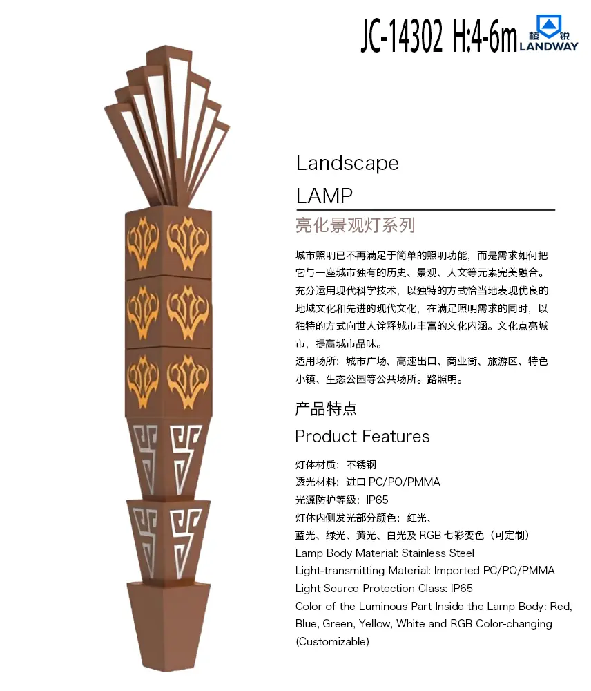 灯体内侧发光部分颜色:红光、蓝光、绿光、黄光、白光及RGB七彩变色(可定制)适用场所:城市广场、高速出口、商业街、旅游区、特色小镇、生态公园等公共场所