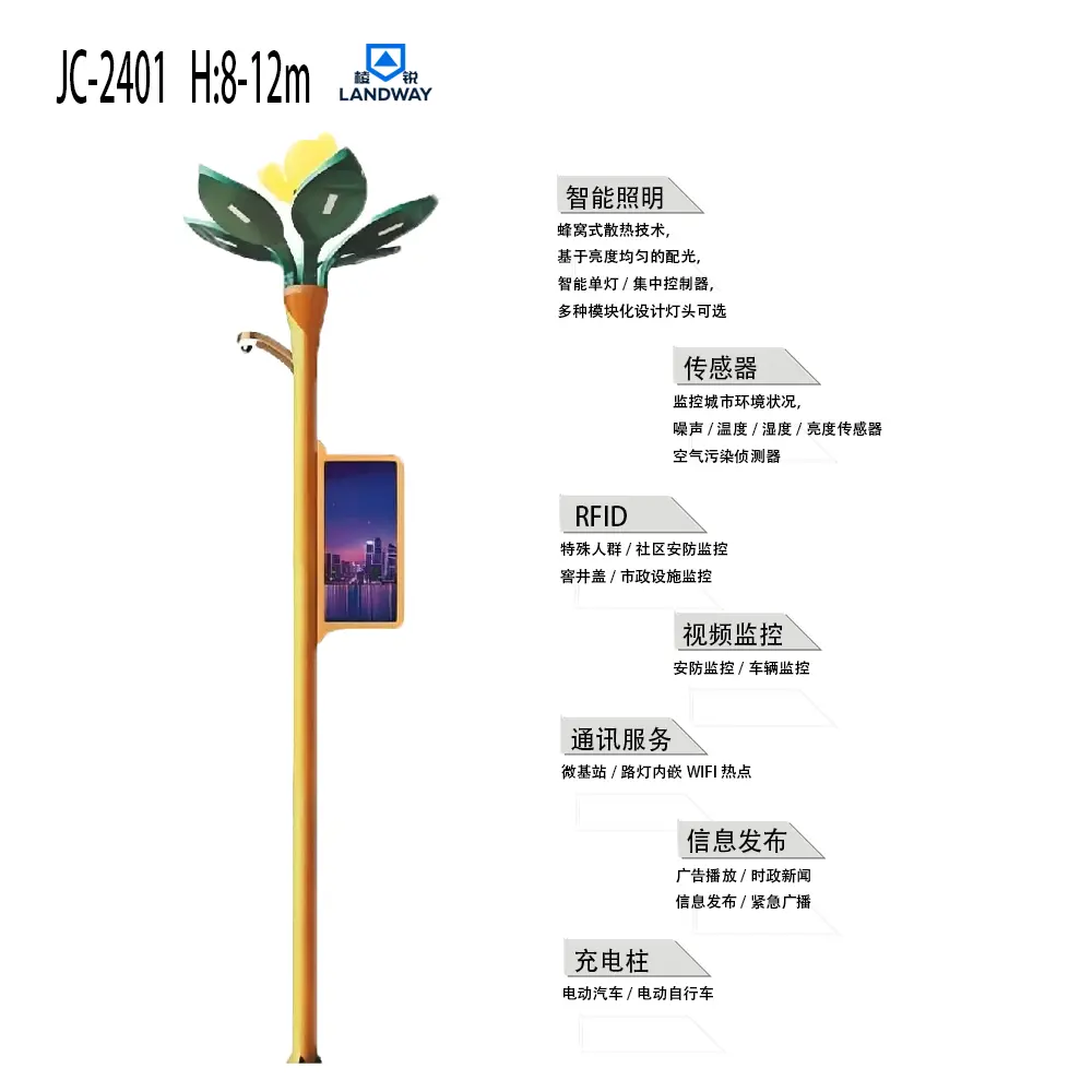 适用光源:LED模组紧固件:紧固螺栓、螺母为不锈钢适用场景:主要用于主干道、迎宾大道、文化旅游区、产业园、特色小镇等道路照明,接入路灯所检测系统和公安天眼监控系统,带广告屏幕、Wi-Fi、充电插座