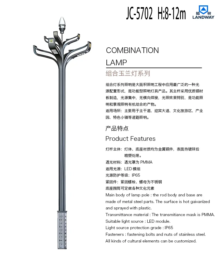 适用光源:LED模组紧固件:紧固螺栓、螺母为不锈钢底座围筒可定做各种文化元素适用场景:主要用于主干道、迎宾大道、文化旅游区、产业园、特色小镇等道路照明