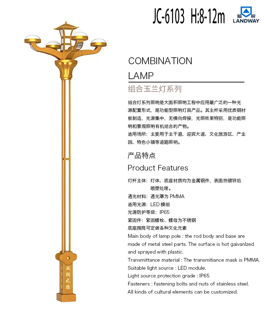 适用光源:LED模组紧固件:紧固螺栓、螺母为不锈钢底座围筒可定做各种文化元素适用场景:主要用于主干道、迎宾大道、文化旅游区、产业园、特色小镇等道路照明