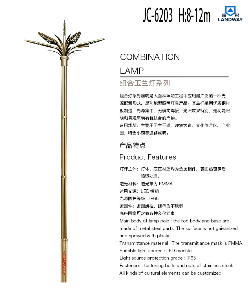 适用光源:LED模组紧固件:紧固螺栓、螺母为不锈钢底座围筒可定做各种文化元素适用场景:主要用于主干道、迎宾大道、文化旅游区、产业园、特色小镇等道路照明