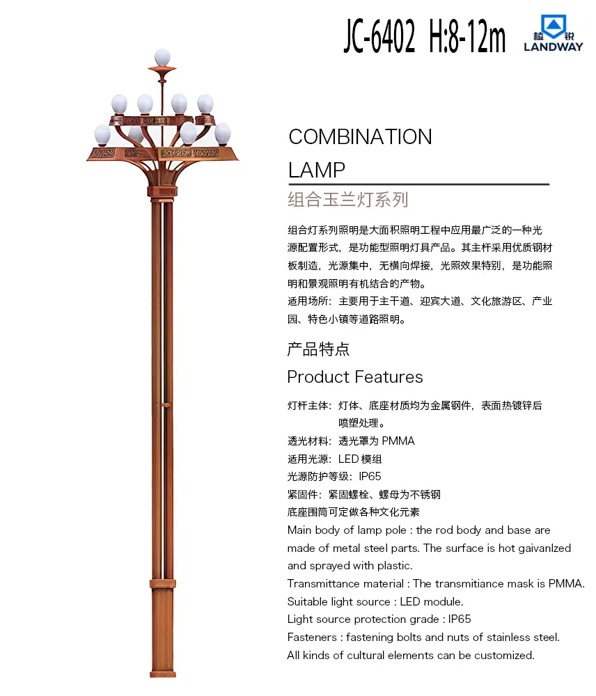 适用光源:LED模组紧固件:紧固螺栓、螺母为不锈钢底座围筒可定做各种文化元素适用场景:主要用于主干道、迎宾大道、文化旅游区、产业园、特色小镇等道路照明
