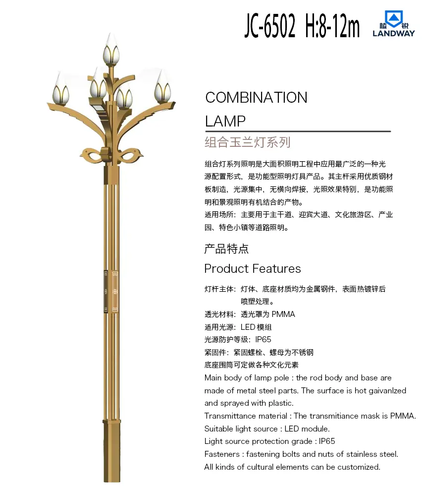 适用光源:LED模组紧固件:紧固螺栓、螺母为不锈钢底座围筒可定做各种文化元素适用场景:主要用于主干道、迎宾大道、文化旅游区、产业园、特色小镇等道路照明