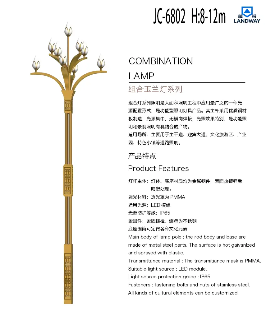 适用光源:LED模组紧固件:紧固螺栓、螺母为不锈钢底座围筒可定做各种文化元素适用场景:主要用于主干道、迎宾大道、文化旅游区、产业园、特色小镇等道路照明