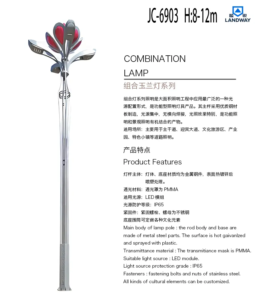 适用光源:LED模组紧固件:紧固螺栓、螺母为不锈钢底座围筒可定做各种文化元素适用场景:主要用于主干道、迎宾大道、文化旅游区、产业园、特色小镇等道路照明