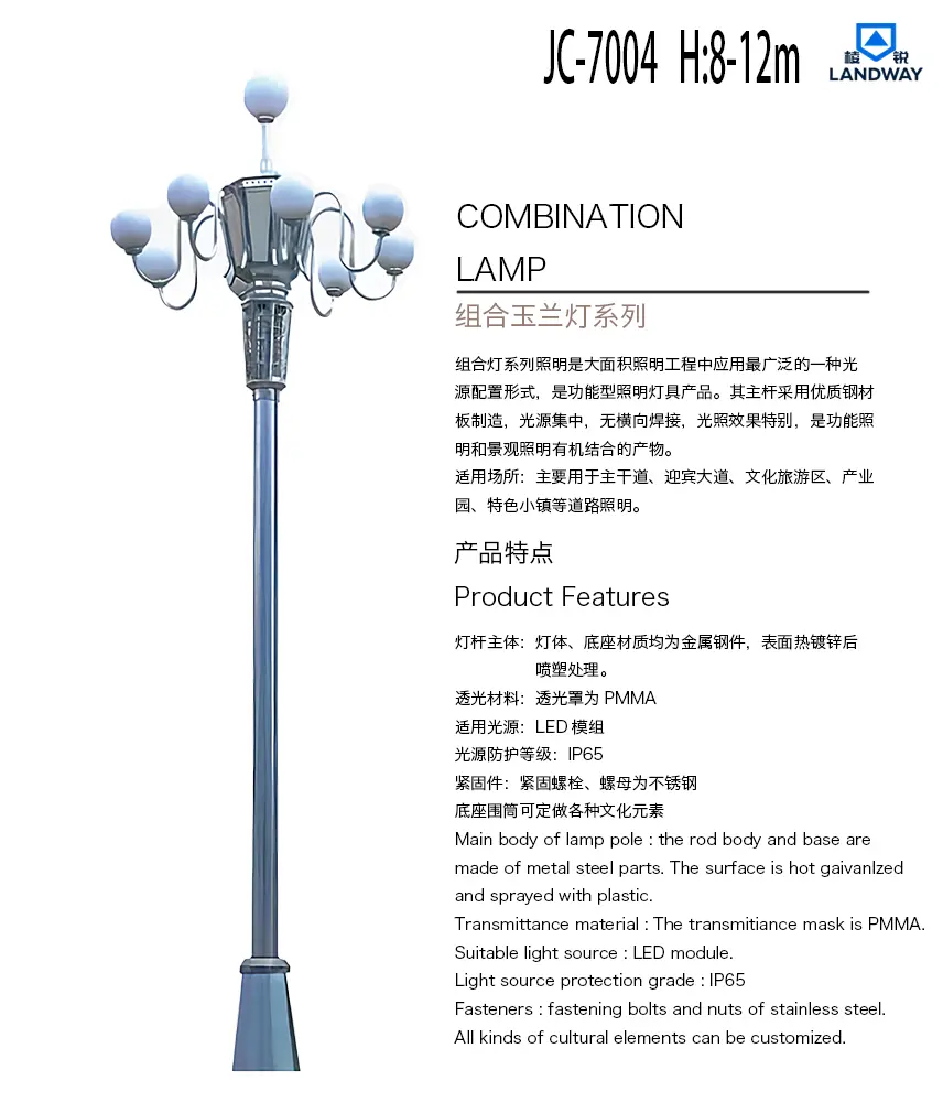 适用光源:LED模组紧固件:紧固螺栓、螺母为不锈钢底座围筒可定做各种文化元素适用场景:主要用于主干道、迎宾大道、文化旅游区、产业园、特色小镇等道路照明